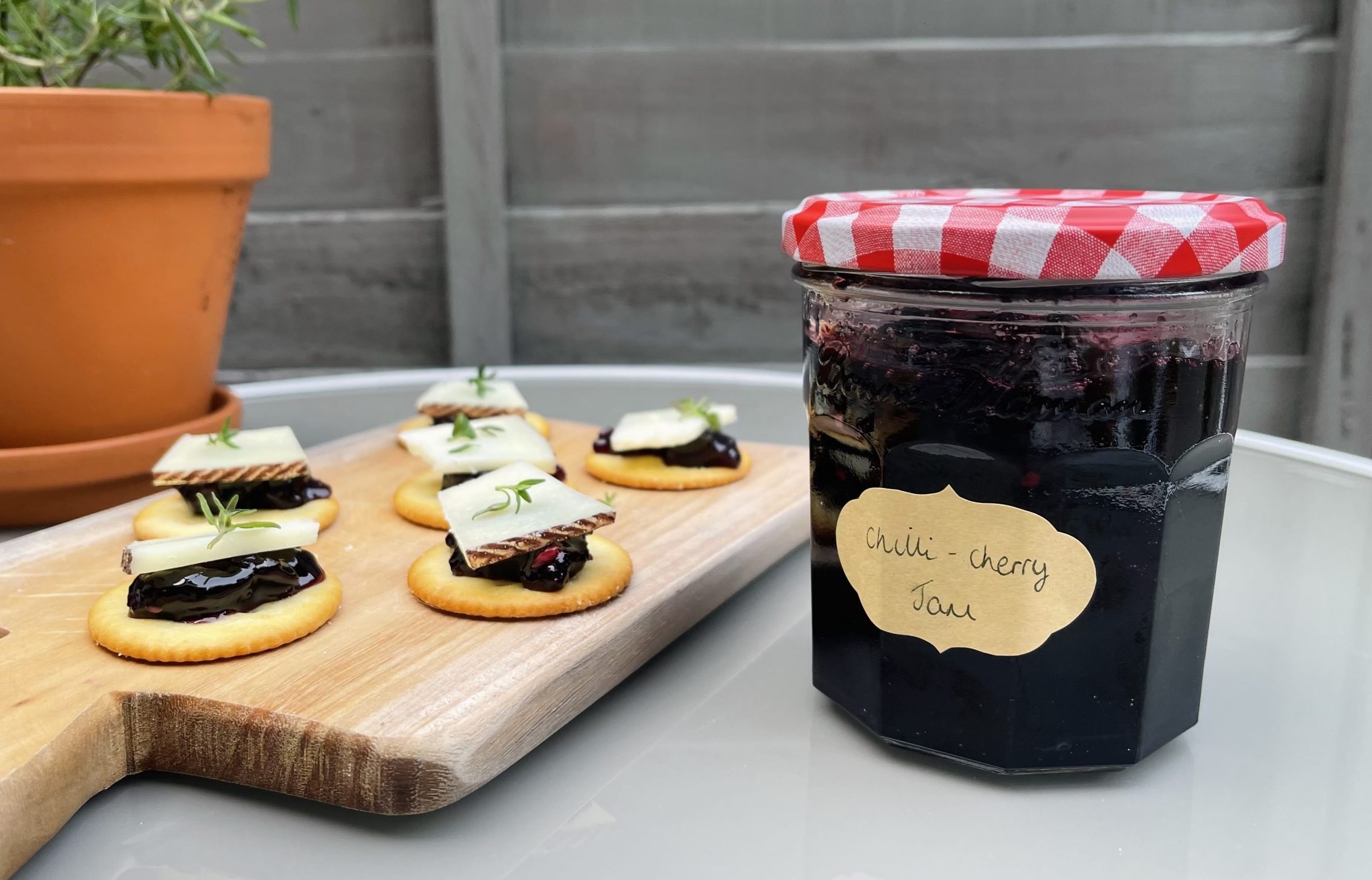 I love jams with a twist – and was recently inspired by a strawberry and chilli jam that I picked up at Chatsworth Farm Shop. Whilst it was tasty, it lacked a certain richness that is needed when pairing with cheese. So, it inspired me to create my own version – a gorgeous, thick, rich cherry jam with a gentle heat from red chillies.