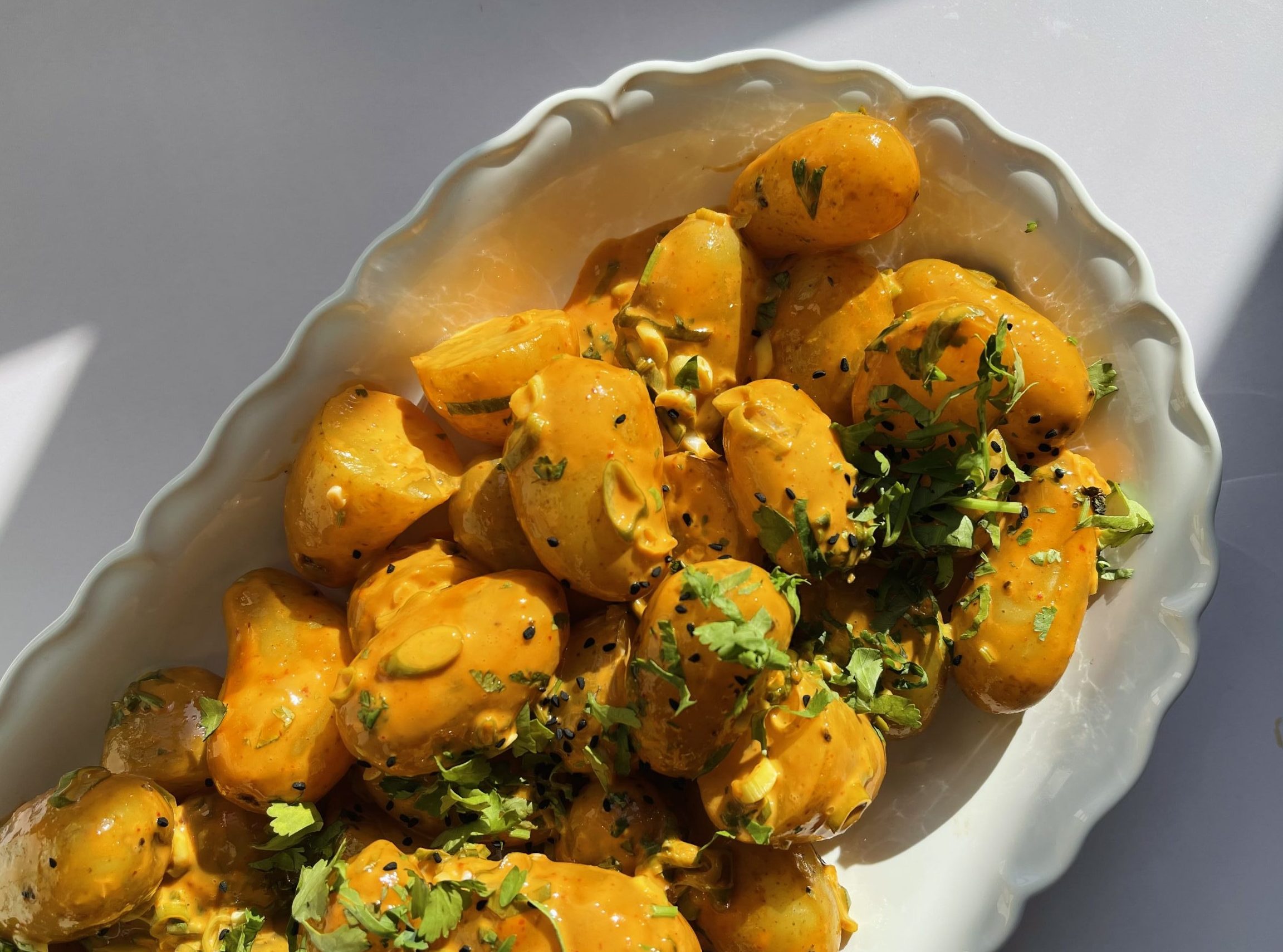 We specifically used the Flying Goose Brand Sriracha Mayo Sauce, which offers a smoky flavour with a slight kick – perfect for mimicking the chipotle depth without any dairy or eggs. Just toss the cooked potatoes and spring onions in the sriracha mayo and top with nigella seeds. That’s it!