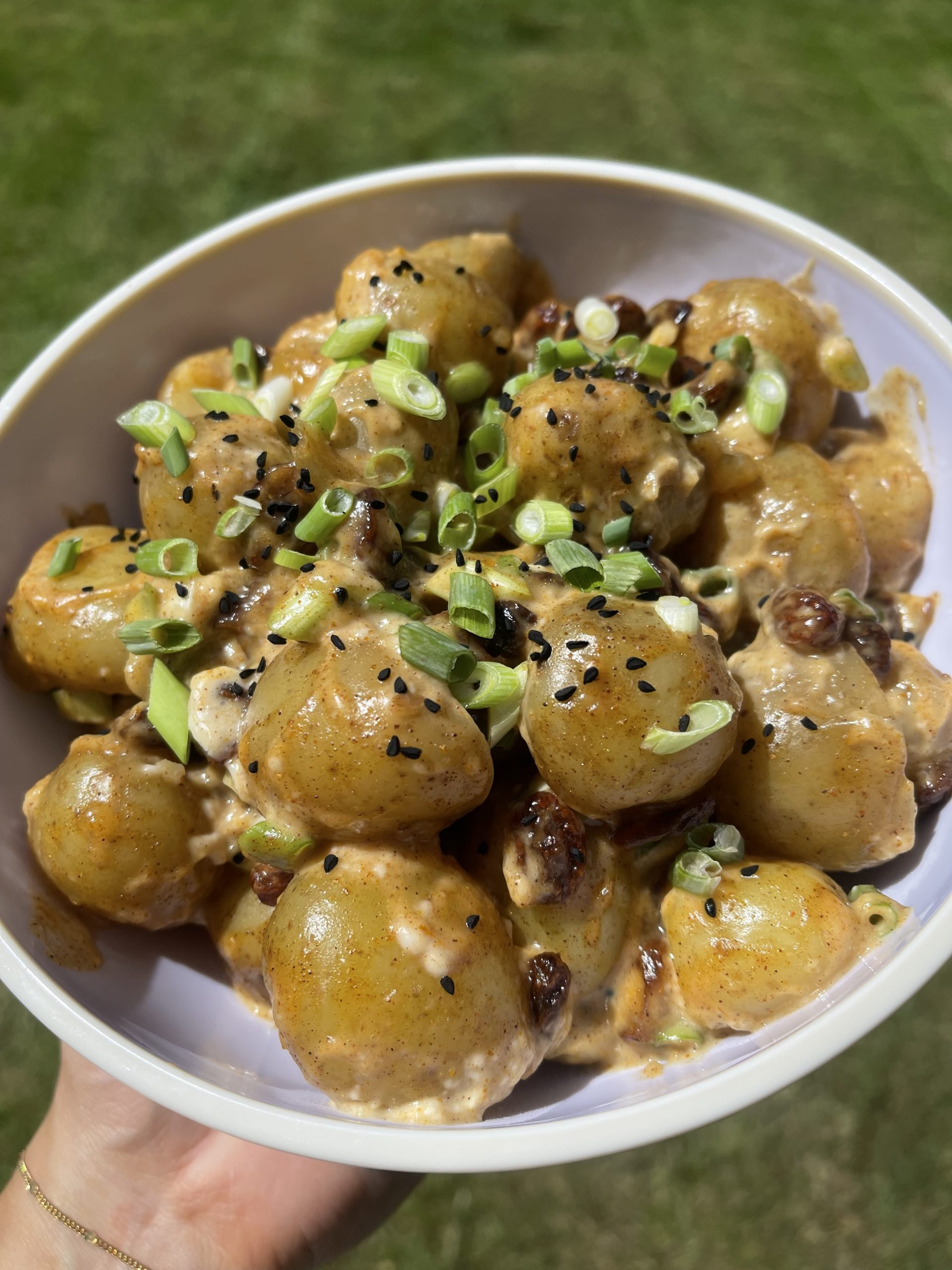 Tis’ the season for salads galore, and you guys loved our recent honey mustard potato salad, so we thought we’d bring you another twist on a classic British favourite! This coronation potato salad is the perfect balance of tang, spice, and crunch from the fresh spring onions – it’s certainly going to be a staple for our house this summertime.