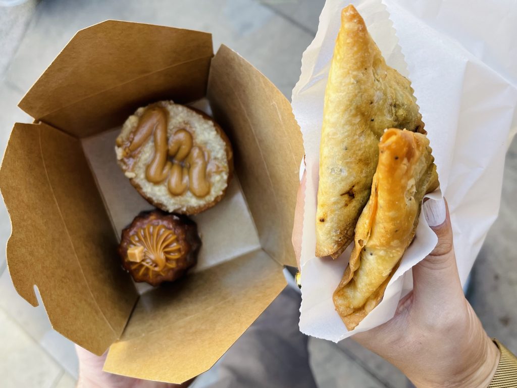 Not long after enjoying the salmon bagel, we spotted Monmouth Coffee serving the most insane looking pastries. We tried a caramel-apple crodough (a croissant-doughnut hybrid), vegetable samosas and a canalé. The crodough was decadent and a little on the sweet side for me, but Jordan happily demolished it. The canalé, on the other hand, completely won me over – chewy on the outside, soft and custardy inside, with a gorgeous caramelised flavour. Honestly, wandering Columbia Road while nibbling pastries and coffee is the perfect Sunday for me!