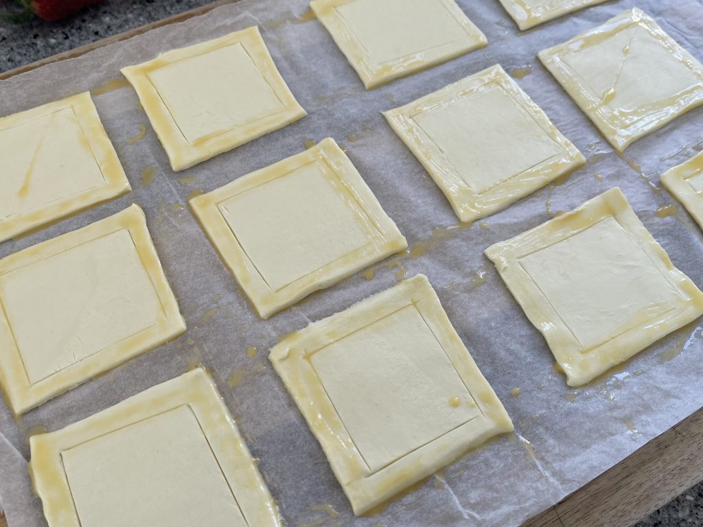 Next, create your puff borders by gently scoring around each square with a sharp knife, and then egg wash each border (it’s easier to do this whilst they don’t have any filling in!).