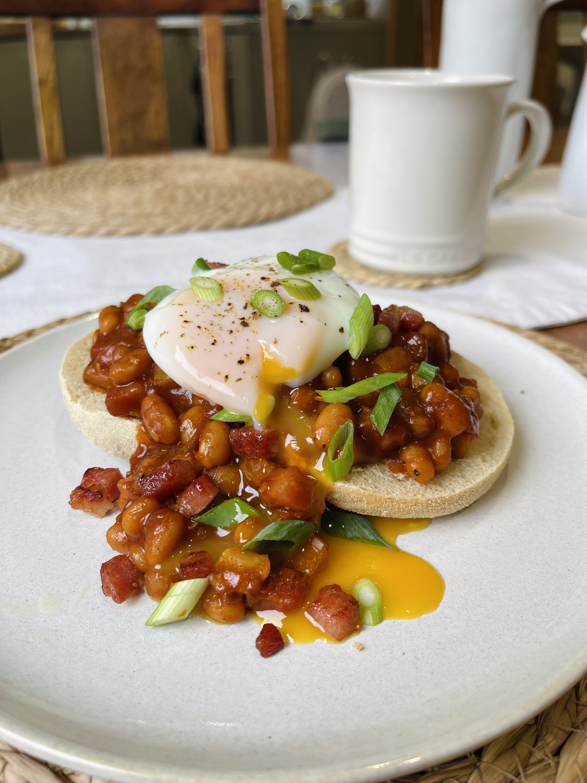 Spoon the smoky baked beans on toasted English muffin and top with a running poached egg. Garnish with a few spring onions, pepper, and a few crispy pancetta pieces. Enjoy!