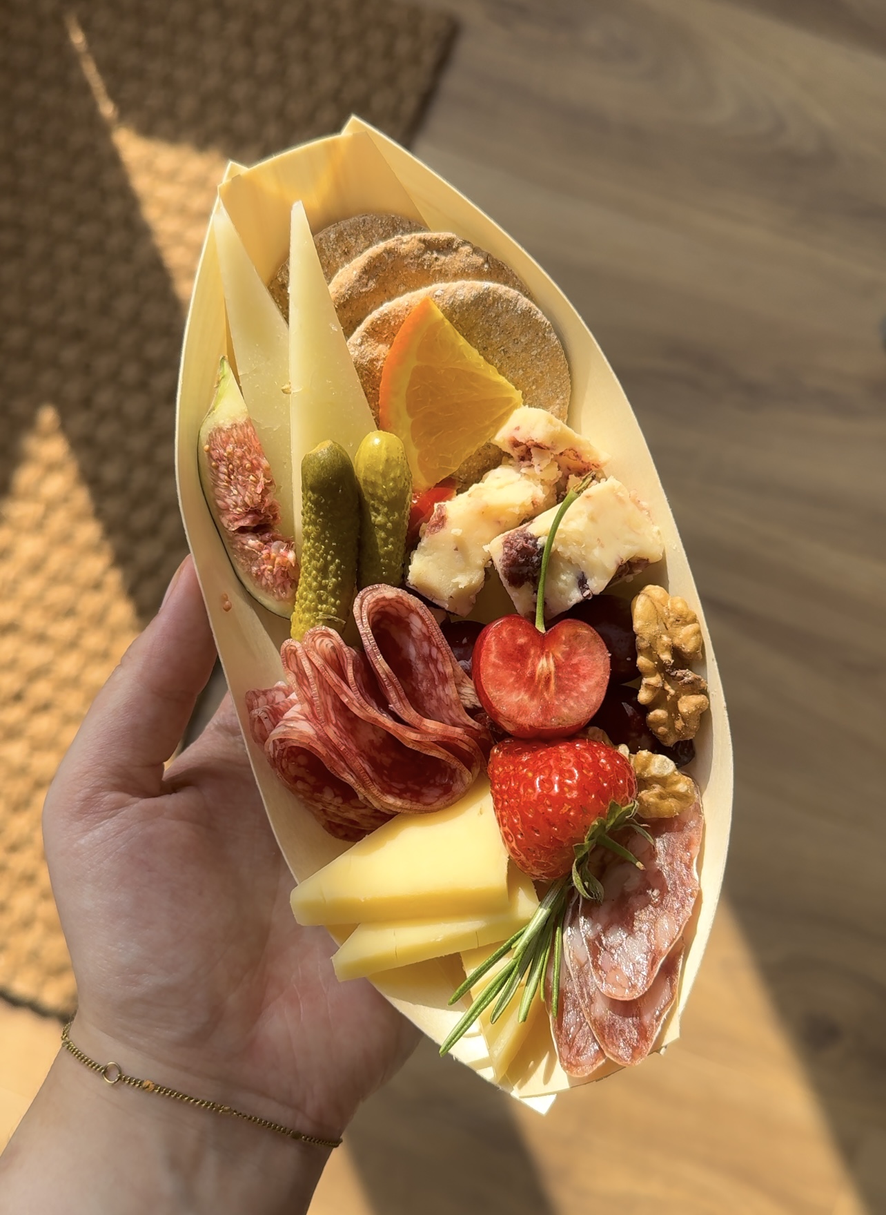 The bottom of the charcuterie cups are filled with nuts and dried berries, with chunks of award winning cheeses, cured meats, olives, and seasonal produce. These generous portions aren’t complete without a selection of crackers!