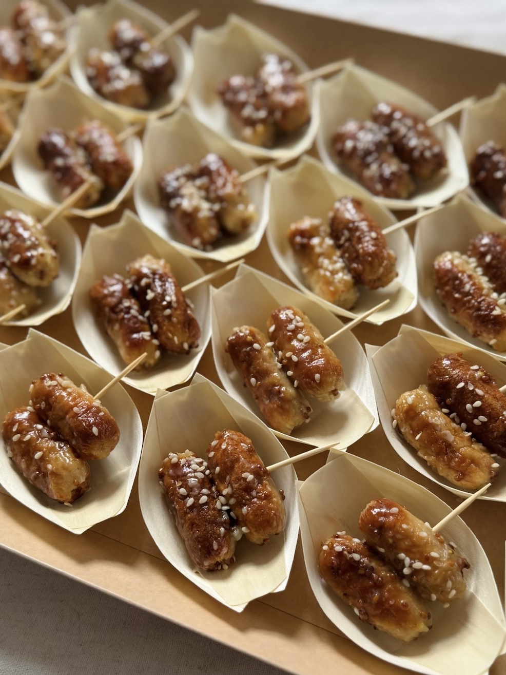 Bring a touch of warmth and indulgence to your event with our irresistible honey-mustard cocktail sausages. Oven baked until golden, each sausage is coated in a sticky glaze of honey and wholegrain mustard, then sprinkled with sesame seeds for crunch.