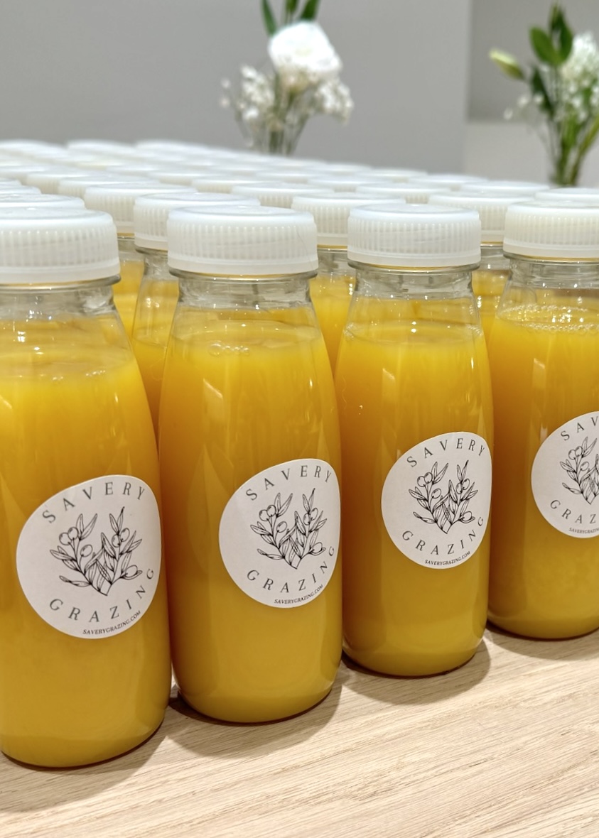 Add a thoughtful finishing touch to your grazing spread with our freshly squeezed juices. They’re perfect for bridal brunches, birthday breakfasts, or corporate events when served alongside our signature yogurt and granola pots or pastry platters.