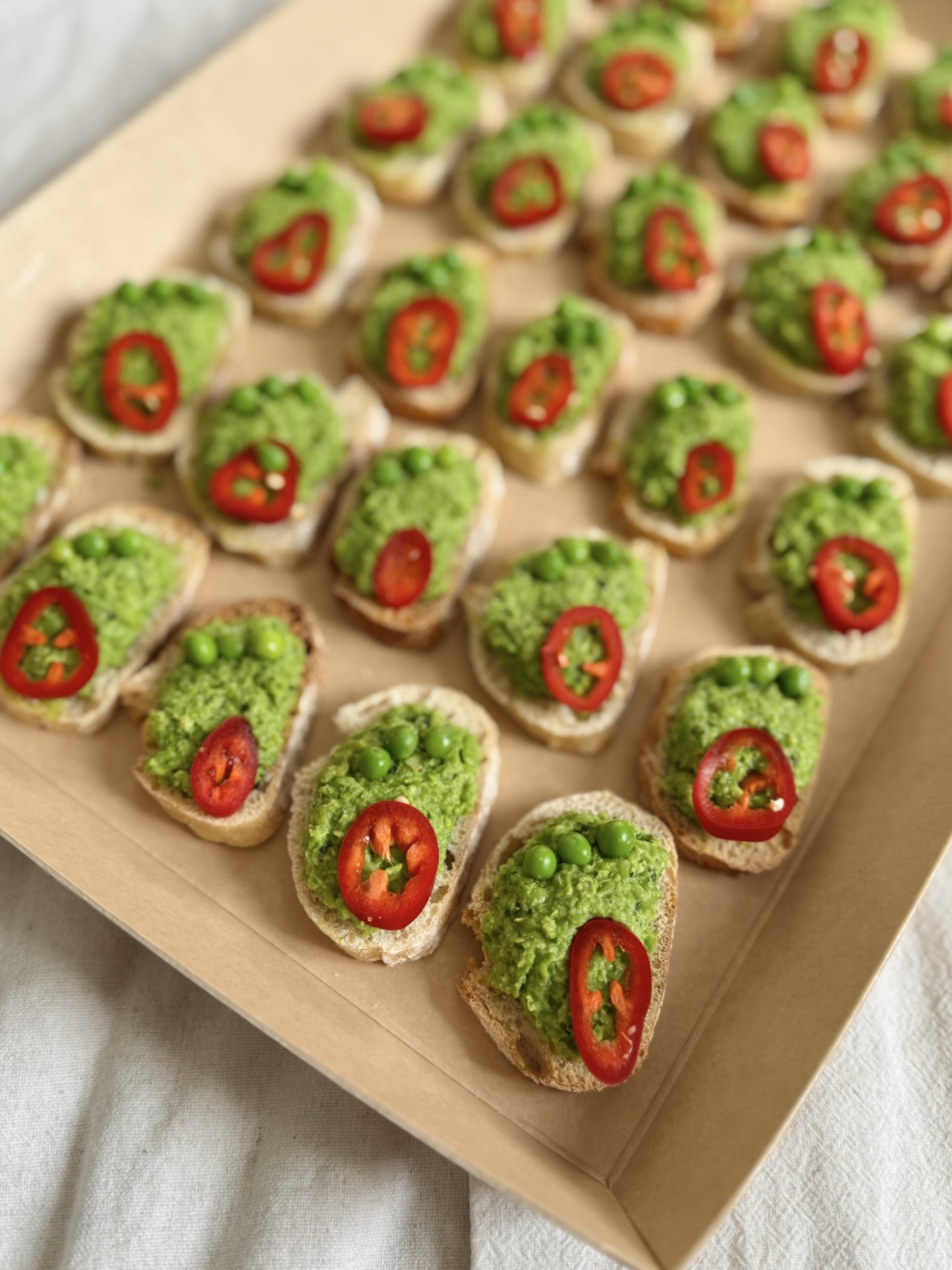 Our Pea & Mint Crostinis are a perfect veggie/vegan canapé option for your special event. Each canapé features a sourdough baguette slice toasted lightly in olive oil, topped with the best of the season petit pois, fresh mint, and a dash of lime, then finished with a slice of red chilli.